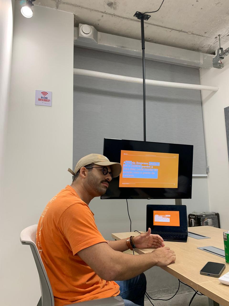Eu apresentando sobre o tema de Tom e Voz para a Squad de Produto.