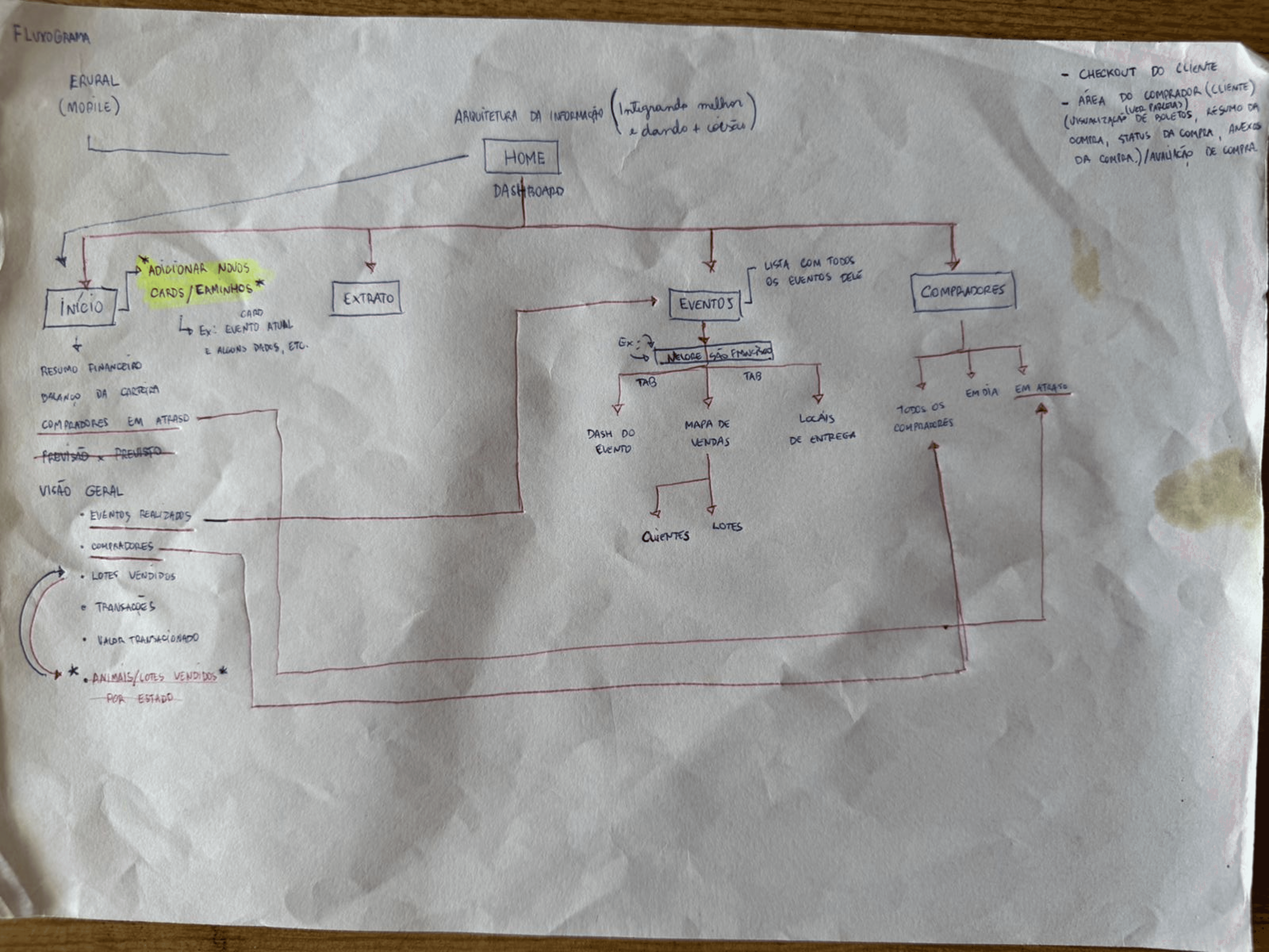 A partir desse contexto, iniciei o redesign da estrutura do mobile, criando este croqui ou estudo para visualizar e reorganizar a jornada do usuário. Mapeei os módulos principais — como Início, Extrato, Eventos e Compradores — e redesenhei os caminhos entre funcionalidades novas e existentes, como mapa de vendas, locais de entrega, dashboards de evento e filtros por status.